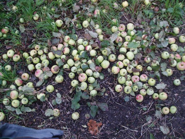 Vlak boven het maaiveld vertakt zich de boom De natte augustus is deze bomen slecht bekomen. Het was al bekend dat Wijnappels gemakkelijk afscheuren. Zo ook bij deze groeiwijze. Eén boom was onder het gewicht van zijn fruit plus de vele nattigheid bezweken en zojuist opgeruimd. De appeltjes lagen nog bij de resterende stam.