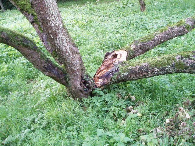 Deze foto laat niets te raden over: de boom is afgescheurd door nat en vruchten. Deze boom is niet de enige die geleden heeft. Diverse bomen laten tekenen zien dat ze in het verleden takken zijn afgescheurd. Eén is er recent nog gespleten.