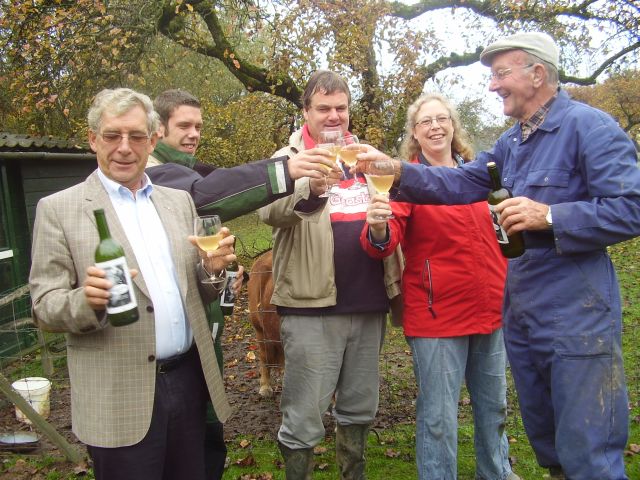 | Dank zij een hobby-wijnmaker konden er van een kist van deze appels enkele flessen appelwijn gemaakt worden. Dit weekend werd de eerste fles Wijnappelwijn van deze 2 oude appelrassen sinds denkelijk mensenheugenis weer ontkurkt. Op de achtergrond de enige hoogstamboom van het ras Eethense Wijnappel die nog teruggevonden is.