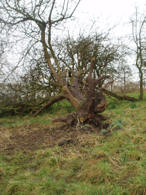 | Als eerbetoon aan de oude boom nog éénmaal foto's. Zie zijn machtige stronk, zijn dikke stam, zijn majestueuze kruin, nu op de grond ineengedrukt. Adieu, ouwe reus. Bedankt voor de vele decennia of misschien wel eeuwen dat je met je appels de winter veraangenaamde en en portie vitamines aan je eigenaren gaf.