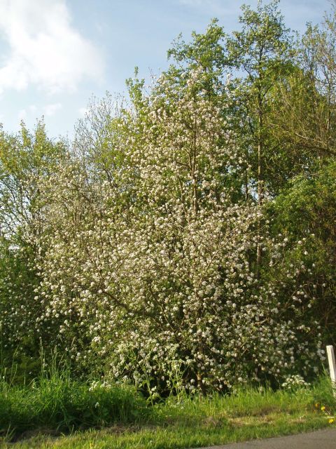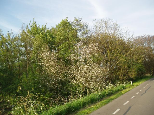 Essen, populieren, wilgen en ander groen straatmeubilair. Daar is niks mis mee, behalve dat deze planten wat saai zijn. Dan fruitbomen met hun bloesem. Zie hier het contrast langs een rivierdijk: bloeiende hoogstamappels tegen een saaie essen-en -populierenachtergrond.