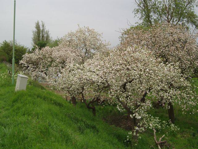 | Donkere wolken pakken zich samen op de achtergrond. Alweer een hoop nattigheid en kou die naar beneden komt. Desondanks, of beter: juist daardoor, komen op de voorgrond de witte bloesemwolken mooi tot hun recht. Ach, de oude Amsterdamse voetballer zei al zoiets: alles heb 2 kanten. Het blijkt maar weer!