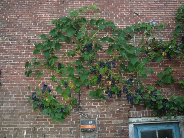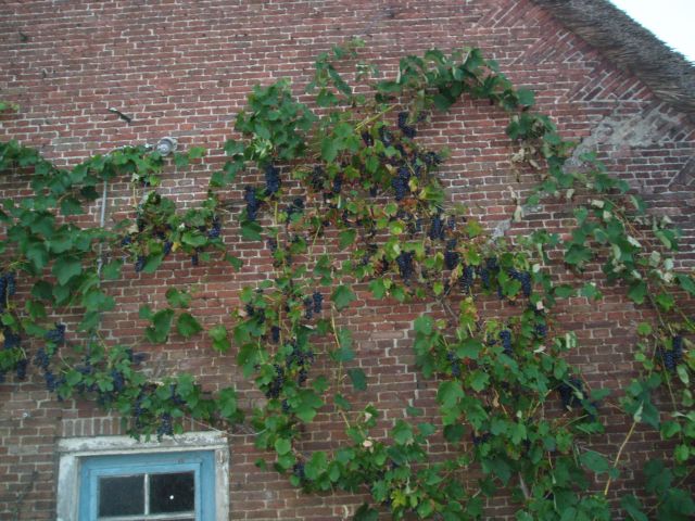 | Mooi, een oeroude boerderijgevel op het zuiden, met blauwe druiven boven een blauwe staldeur. Frankrijk in Nederland!