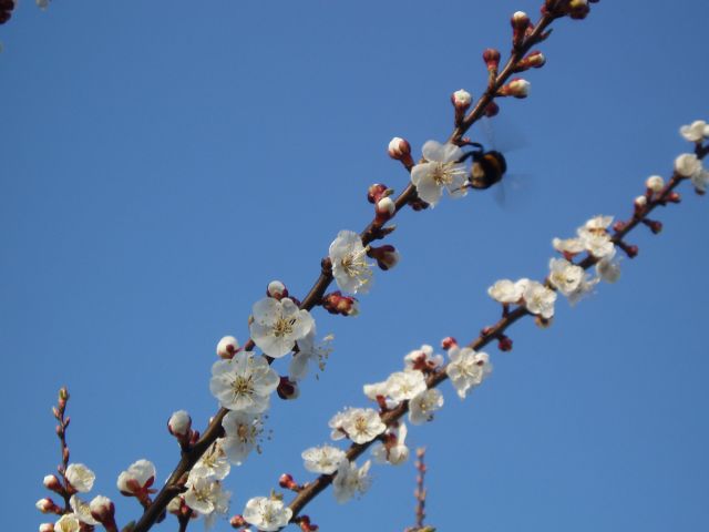 De abrikozen beginnen hun pracht te laten zien, net als de eerste perziken. En... de hommels zijn present. We snapten er één nadat hij van de nectar in deze bloesems had geproefd |