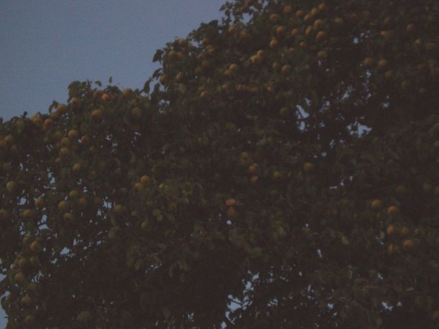 | Een oude Dubbele Flip, vol vruchten, bij ondergaande zon. De duisternis valt, de laatste stralen belichten nog de de op wel zeker 7 meter hoogte hangende vruchten. Apart, oudhollandsch...