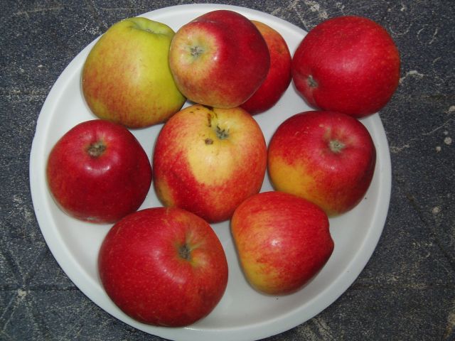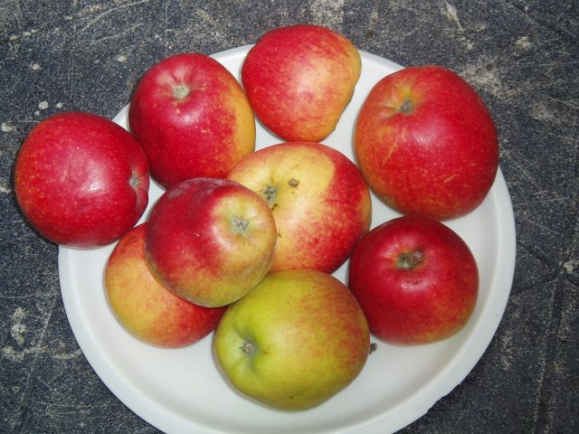 | Engelse Bellefleur wordt ie ook wel genoemd, de Koningszuur. Per ongeluk liep ik een oude hoogstamfruitboom tegen het lijf, waar ze aan hingen. Eerlijk gezegd had ik het ras nog nooit in levende lijve gezien. Nou, de naam Bellefleur is terecht, de prachtig rode kleur, contrasterend met tamelijk fel geel, is immers typerend voor Bellefleuren.