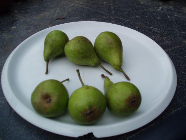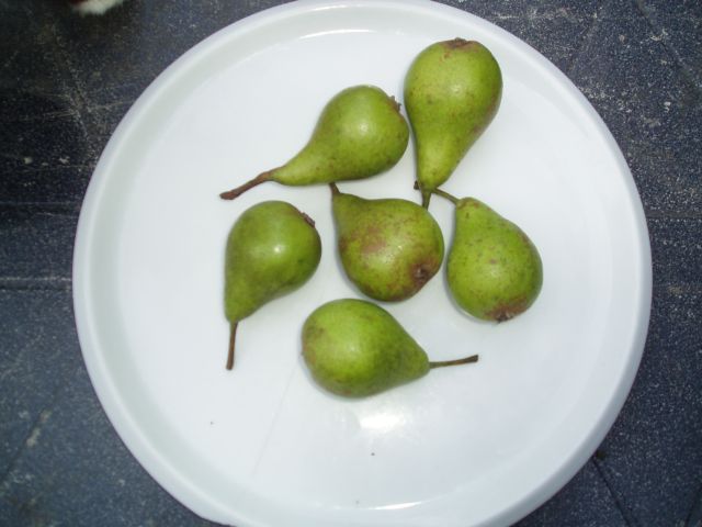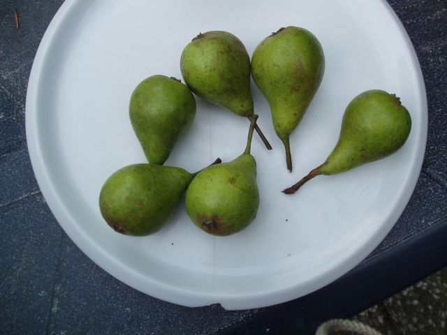 | Uit het westelijk rivierengebied kwamen deze kleine peertjes. "Late Groentjes" zei de wijze oudere heer, die eerder ook al andere rassen mèt juiste naam had aangedragen. De peertjes kwamen van een door de rijke dracht gespleten boom. Mijn zegsman vertelde: "Deze peertjes werden in de tijd dat er nog geen goede koelingsmethodes waren in deze streek veel geteeld. Ze waren namelijk erg windvast; tot in november hingen ze aan de boom". Kortom, we hebben te maken met een lang (aan de boom alleen al) houdbaar stoofperenrasje. Alleen, de vraag is: is dit een regionaal rasje, of is de naam "Late Groentjes" een streeknaam voor een landelijk bekend ras dat ik zo niet herken? Pomologen van Nederland, willen jullie mij ajb helpen: hebben jullie zo op het zicht suggesties welk rasje dit zou kunnen zijn, of heb ik hier een streekras in handen?