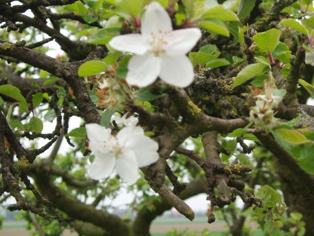Nog net op tijd voor een foto van één van de laatste bloesems van een als Borsdorfer gedetermineerde appelboom.
