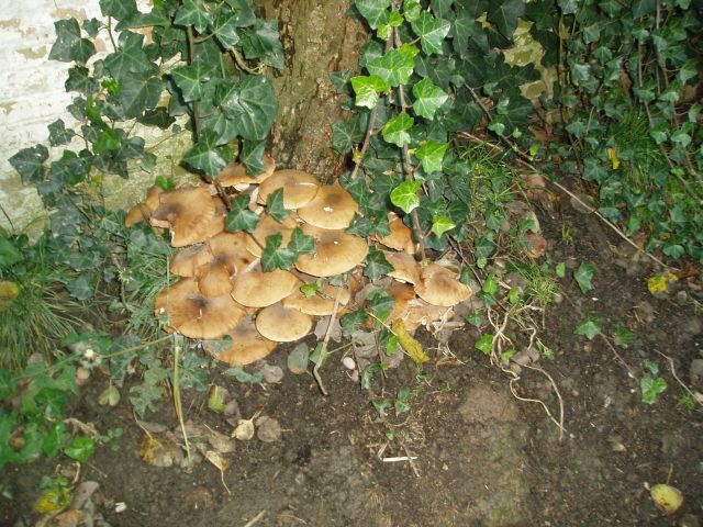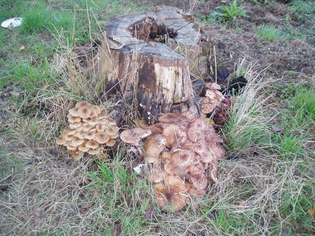 Paddestoelen bij overleden walnoot van zeker eeuw oud