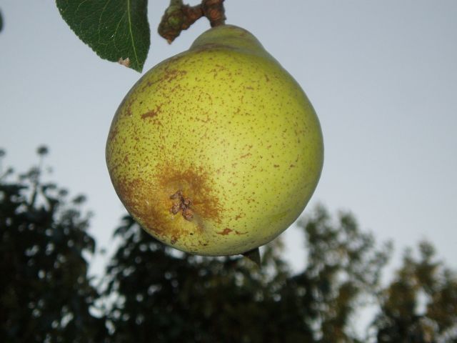 Nog meer schimmelachtigen bij de voormalige walnoot Nog een foto van dezelfde paddestoelen bij een andere boom, een Williams Duchess die ook meer dan een eeuw de boerenfamilie verraste met rinse perenvruchtenvlees zo sappig als een pruim. De boom, een leiboom aan de oostzijde van een oud schuurhuis, leeft nog, maar haar vruchten beginnen een beetje stenig te worden. Dat is een proefbaar teken van het naderende einde. Maar toch, in het licht gloreert, waarschijnlijk voor de laatste keer, een prachtige goudgele vrucht.