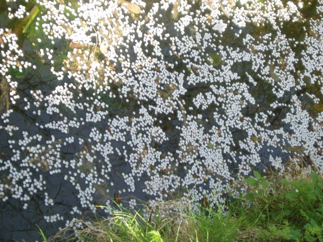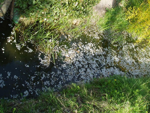 Zo maar een mooie lentedag in de buurt van de Betuwe. Het oog, en dus de lens van de camera, valt op een sloot met stromend water. Er liggen witte rondjes op het water. Heeft iemand het opvangbakje van de perforator leeggegooid? Nee, het zijn geen papierondjes. Het zijn blaadjes van kersenbloesem die meestromen in de sloot. Mooi. Een kunstenaar zou het zo mooi niet hebben kunnen verzinnen.............