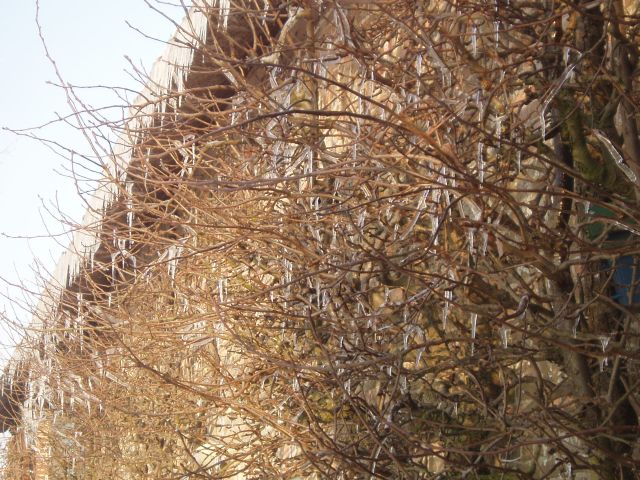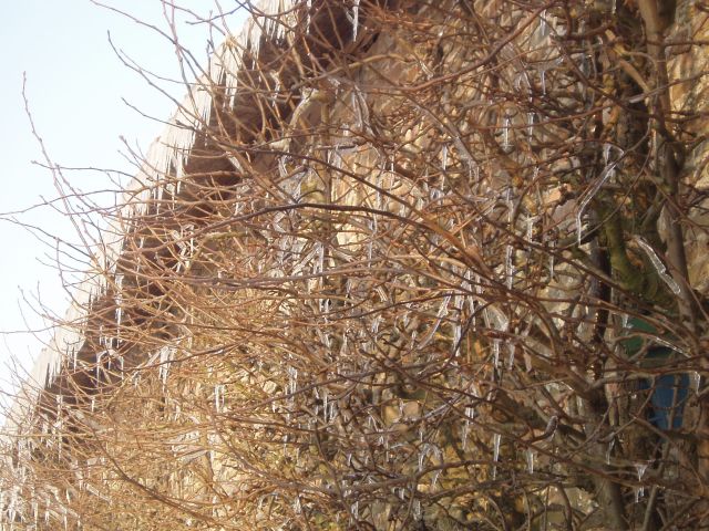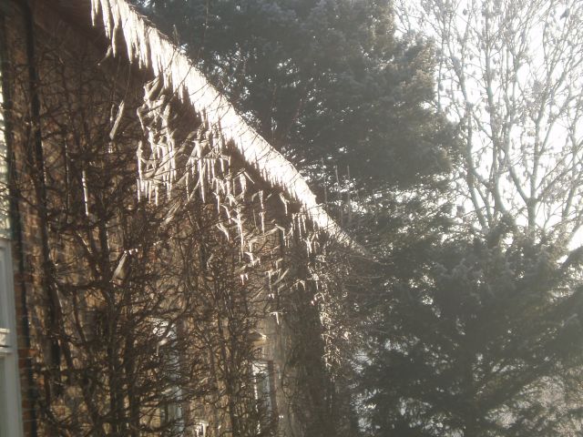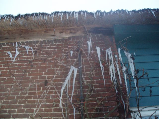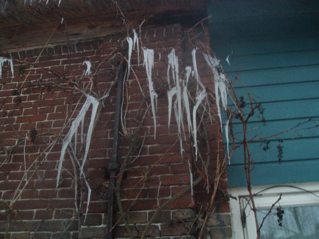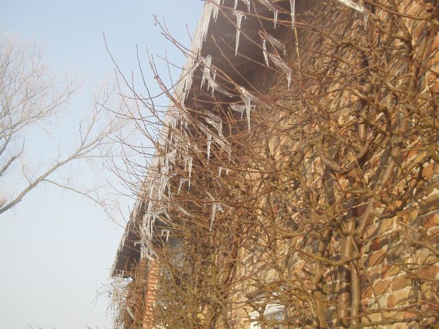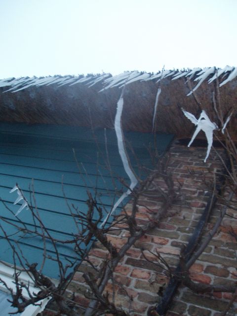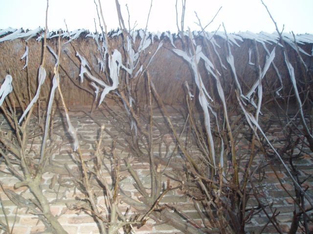 | Sneeuw, temperatuur dan es onder, dan es boven nul, en een rieten dak. Daaronder een leipeer en een druivestruik tegen de gevel, nog niet helemaal gladgesnoeid. Het resultaat: kijk zelf maar!