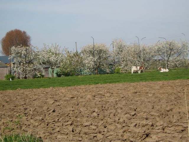 | Nederlandser kan het bijna niet. Roodbonte koeien, geploegde rivierklei en een hoogstamkersenboomgaard met mogelijkheid om er een net overheen te spannen. Typisch voor de Betuwe en omliggend rivierenland. Wie er van wil genieten, moet vlot naar het rivierenland gaan. Nog een week, dan zijn de appels in volle bloei, de peren en kersen zijn doorgaans met koninginnedag al over het hoogtepunt van hun bloei heen.