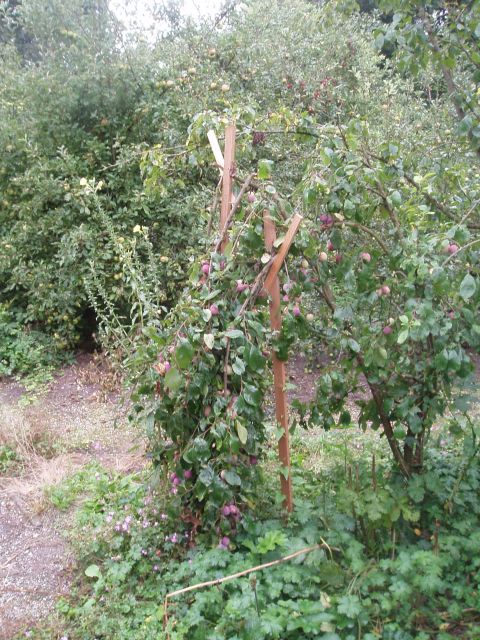 Er was eens een jonge pruimenboom, Victoria's zo te zien. Het boompje had er zin in, en de baasjes keken met gulzige ogen naar de vele pruimen. De pruimen, die groeiden en groeiden. De baasjes dachten: "laten we wat steun bieden". Een terechte gedachte, maar één die in dit geval te veel vanuit eigen gewin was ingegeven. "Knak"zei menig tak. "Had je me maar gedund, ik had je de vruchten graag gegund" zei de boom. En de baasjes? Die zitten nu te zitten met een treurpruim en moeten kiezen tussen een nieuwe boom planten of een paar jaar wachten op herstelgroei van hun lieve boompje. Nèt geen treurpruim