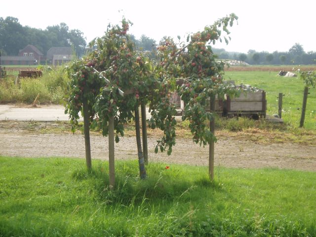 Nog een foto van een zwaarbeladen pruimenboom. Alleen, hier ging het tot op heden net wel goed. De steunplankjes zijn net wat beter gepositioneerd, of de boom is net een jaar ouder dus steviger of de vruchten zijn net wat minder talrijk. Of wellicht waaide het hier niet zo hard. Voor als je pruimenboom ooit nog vol komt te hanhen, zie dan bij deze twee foto's hoe buigen en barsten dicht bij elkaar liggen.... Foto's: Bas van Andel |