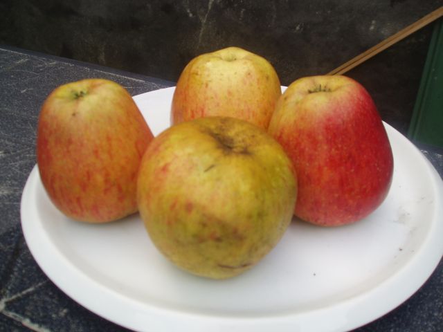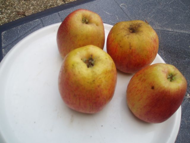 | Welaan, hier zijn ze. De oude dikke boom is door vrijwilligers gesnoeid. Met als resultaat dat de oude eigenaar-baas nog nooit zulke mooie grote appels heeft gehad als dit jaar. Als je ze bekijkt, zie je waarom ze ook wel "Slanke Zoete Renette" heten. Ook de naam Kaneelzoet wordt volgens "De Boomgaard" gehanteerd. Alleen, daar zit nou net het probleem. In de rubriek "Wondere Fruitwereld in beeld" plaatste ik in september afbeeldingen van een appel met een Kaneelsmaak. De oude fruitrasliefhebber , voormalig fruitboer, noemde het ras vol overtuiging "Kaneelzoet" Maar als je die "Kaneelzoet" uit de Wondere Fruitwereld van september 2008 vergelijkt met deze Slanke Zoete Renette, zie je dat er twee vormen zijn: een korte, dikke en een lange, slanke. De korte dikke heeft de uitgesproken kaneelsmaak; de Slanke Zoete Renette heeft die veel minder. Ook de oude fruitboer ervaart dat de Slanke Renette minder uitgesproken Kaneel-achtig smaakt. Leg je de twee appels naast "De Boomgaard", het boek uit 1868, dan stel je vast dat de Kaneelzoet uit de Wondere Fruitwereld niet de Slanke Zoete Renettes volgens het boekje zijn. Voorshands de volgende stelling. Volgens "De Boomgaard"komt de Slanke Zoete Renette uit de buurt van Gorinchem. Daar is al minstens 500 jaar "professionele" fruitteelt. Er zal dus wel geëxperimenteerd en gekruist zijn met e e n Kaneelappel en zijn bijzondere smaak. Alletwee hebben ze kenmerkend kartelblad, overigens. Wellicht is de stelling gewaagd dat we een korte dikke Kaneelappel enerzijds hebben en een Slanke Zoete Renette (uit "De Boomgaard") anderzijds. Wordt ongetwijfeld vervolgd.....