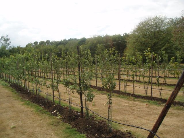 Op de achtergrond hardfruitbomen, geleid volgens hetzelfde systeem.